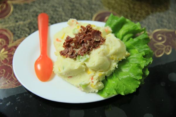 點評:土豆泥很細膩,加入了玉米、黃瓜和胡蘿卜之后,不光色彩搶眼,而且營養豐富。火腿和沙拉醬的組合,更是讓整道菜帶點淡淡的甜和淡淡的咸鮮,又奶香味十足,非常適合老人孩子食用。