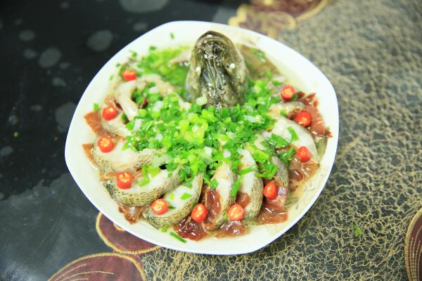 制作方法:鱸魚洗干凈,先將魚頭切下;剪掉魚鰭,從頭部開始,用刀從魚背往魚腹切到魚尾處,切忌不可切斷;將鹽和料酒制作成的混合物抹遍魚全身,腌制15分鐘備用;生姜、蔥切絲,墊在盤子底部,將腌好的魚擺出孔雀開屏的造型,魚頭放在最前面,尾巴部分也可單獨切下來,放在魚頭下方;擺好造型后,在每一塊魚肉中間夾入一小片火腿,再在魚上鋪一層姜蔥絲,冷水入鍋,大火蒸10分鐘即可出鍋;出鍋后,去掉上面的姜蔥絲,淋上一點生抽,再放上適量蔥末;鍋內倒油,燒熱后淋到魚上,再放上若干紅辣椒裝飾即可。