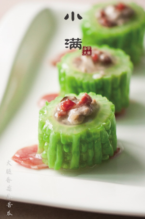 3. 將調好的餡料塞入苦瓜內,擺盤,上火隔水蒸8分鐘起鍋即可。