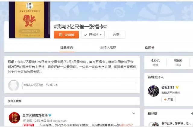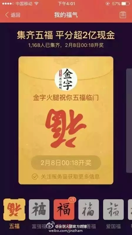 自前幾天支付寶將“集5福,搶2億+紅包”的活動規(guī)則公布后,一時間,有關(guān)福卡換贈的話題強行霸屏。在有金字粉絲集齊了五福后,金字順勢在微博平臺上策劃的#我與2億只差一張福卡#的微話題就引發(fā)了高達4.6億的閱讀量,網(wǎng)友們通過點贊評論及轉(zhuǎn)發(fā)分享的方式,第一時間表達了自己對于五福福卡和春晚2億紅包的高度期待!