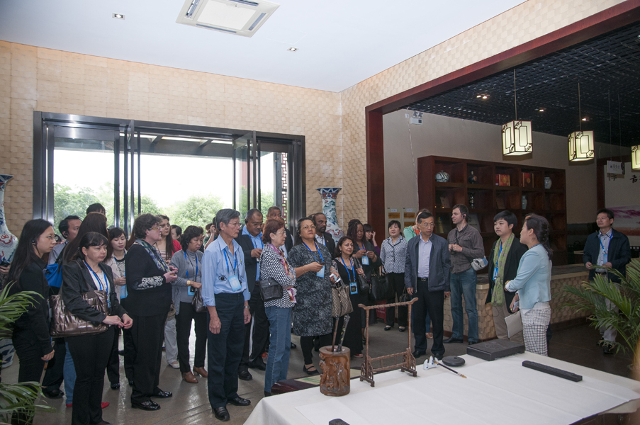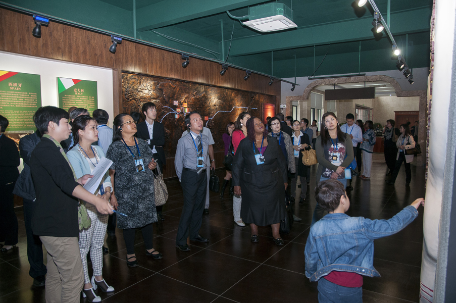 從一進中國火腿博覽館的大門開始,使節(jié)們就被眼前精美的浮雕所吸引。透過金字火腿吳月肖副總經(jīng)理有趣的解說和翻譯的詳盡翻譯,50余人才搞明白:原來這就是著名的《百姓勞軍圖》,而使節(jié)中的一些“中國通”發(fā)現(xiàn)他們熟知岳飛的師傅宗澤,原來竟然是金華火腿的祖師爺,火腿原料金華兩頭烏如此有趣珍貴,就好比中國的熊貓。